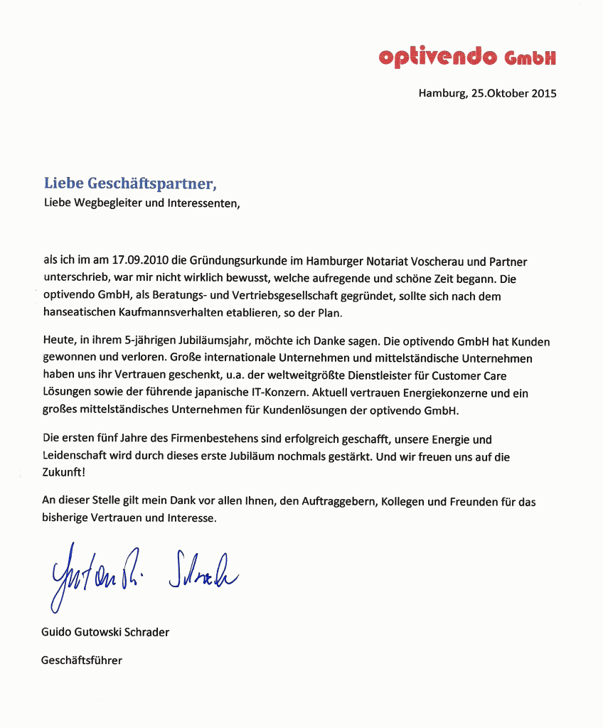 Am 17. September 2010 wurde in Hamburg die optivendo GmbH gegründet. Gründungsmitglied und Geschäftsführer Guido Gutowski Schrader blickt auf fünf erfolgreiche Jahre zurück.